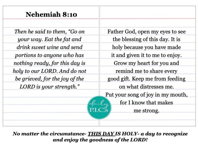Even this day is holy to the LORD. God has made it, and He is good. I am challenging myself with two application points- I’m asking God to open my eyes to see at least one good thing to enjoy each day? Instead of dwelling on the stress, I’m reminding myself of the goodness of God. My prayer is that this will produce joy-filled strength to stay the course since the detour has become the road.